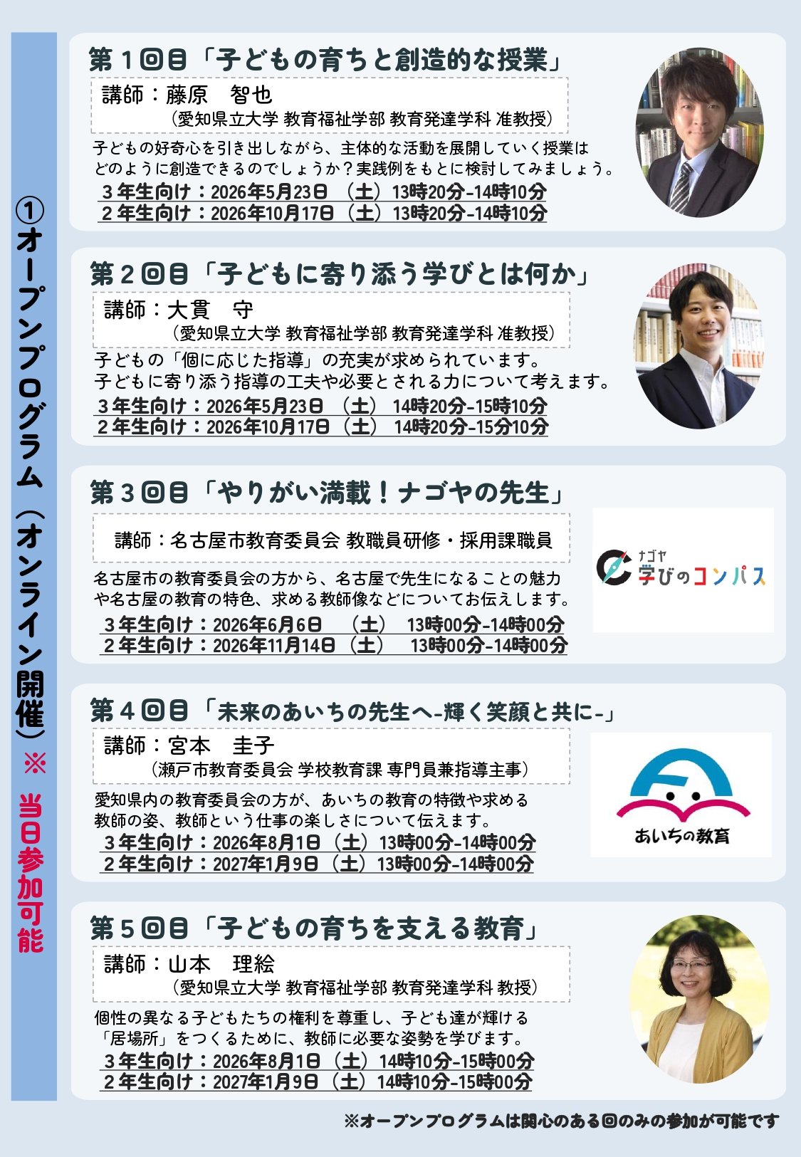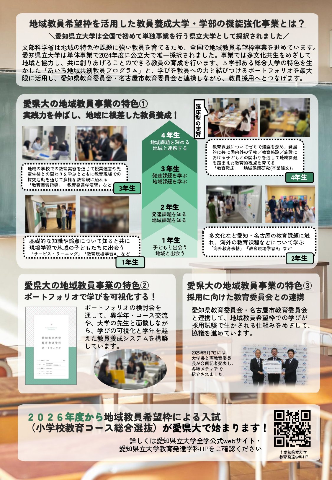 愛知県立大学では、文部科学省選定「地域教員希望枠を活用した教員養成大学・学部の機能強化事業」のもと、愛知県・名古屋市・長久手市・瀬戸市・日進市・尾張旭市の各教育委員会と連携して次世代の教員育成に取り組んでいます。この一環として、2026年度より地元の小学校教育に関心のある高校生を対象とした講座「愛・地域教員へのトビラ」を新たに開講します。地域の教育課をを自ら学び、地域と共創する力を備えた「未来の先生」を目指す高校生の皆様の参加をお待ちしております♪