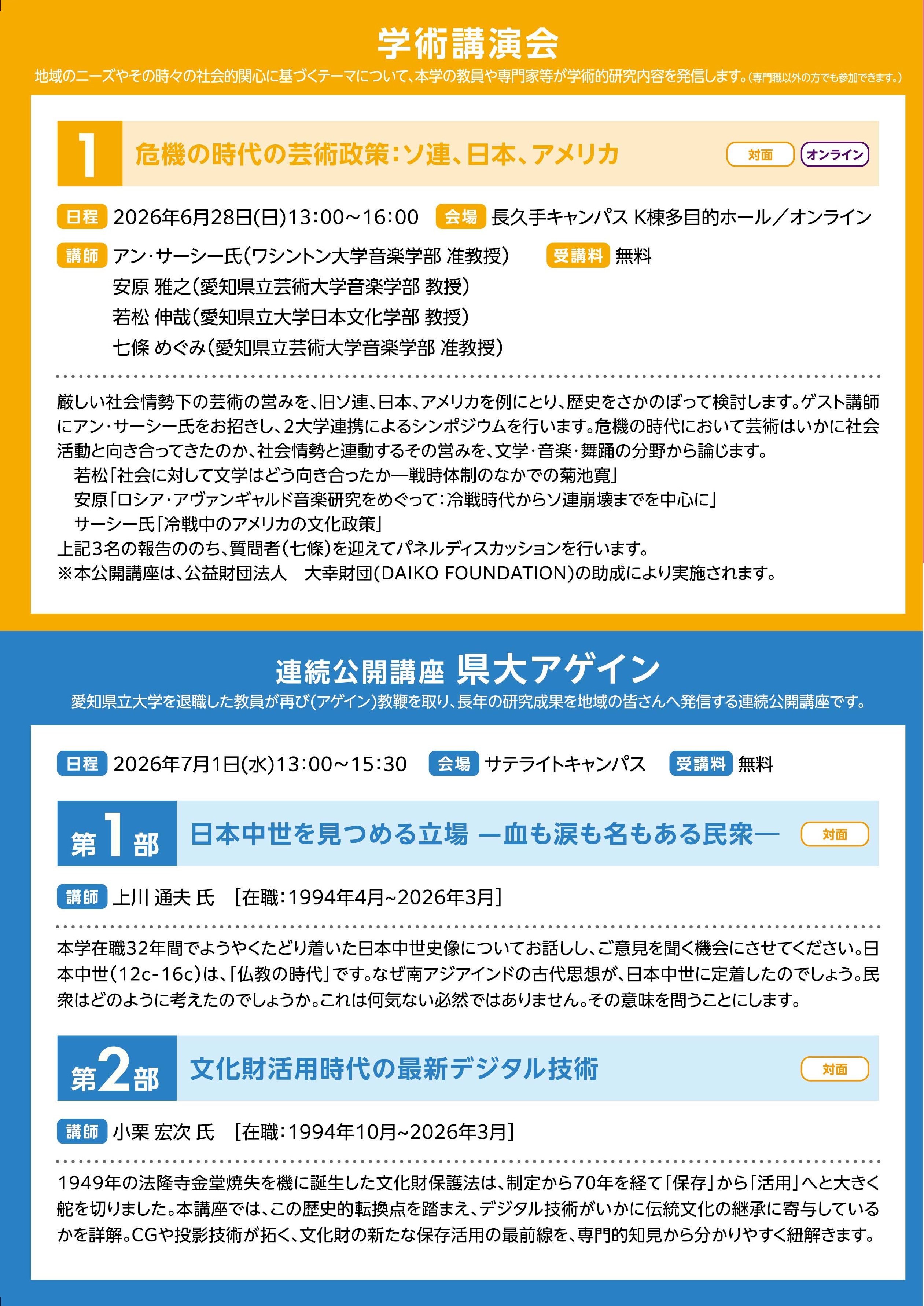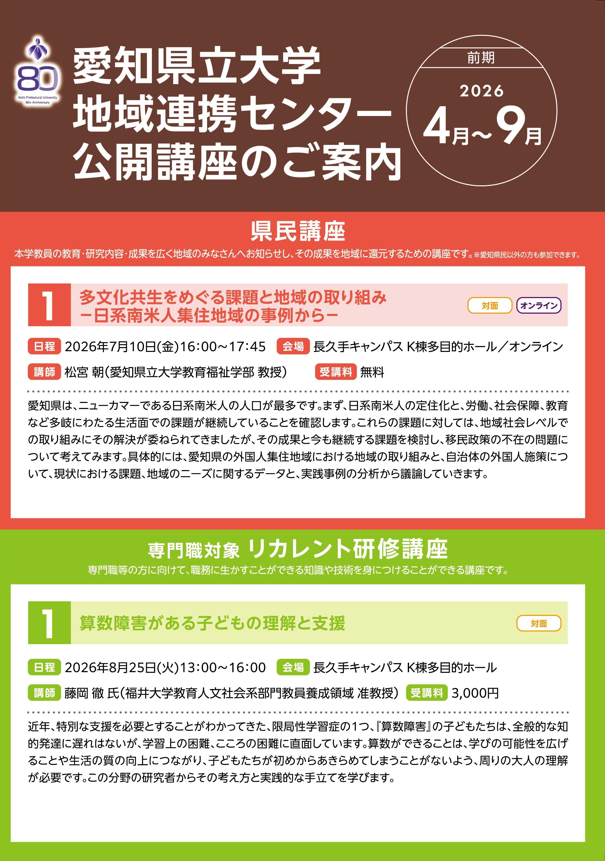 2026年前期 愛知県立大学地域連携センター公開講座のご案内(イベントカレンダー)を公開しました!