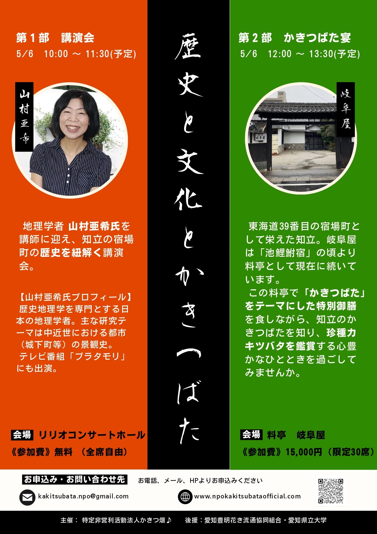 | 事前申し込み | ■申込締切日:2026年4月27日(月) ■定員:80名 ※定員に達し次第、締め切らせていただきます。 ■お申込み先:特定非営利活動法人かきつ畑♪ お申込みはお電話・メール・HPよりお申込みください ・電話:090-8546-3994 ・メール:kakitsubata.npo@gmail.com |