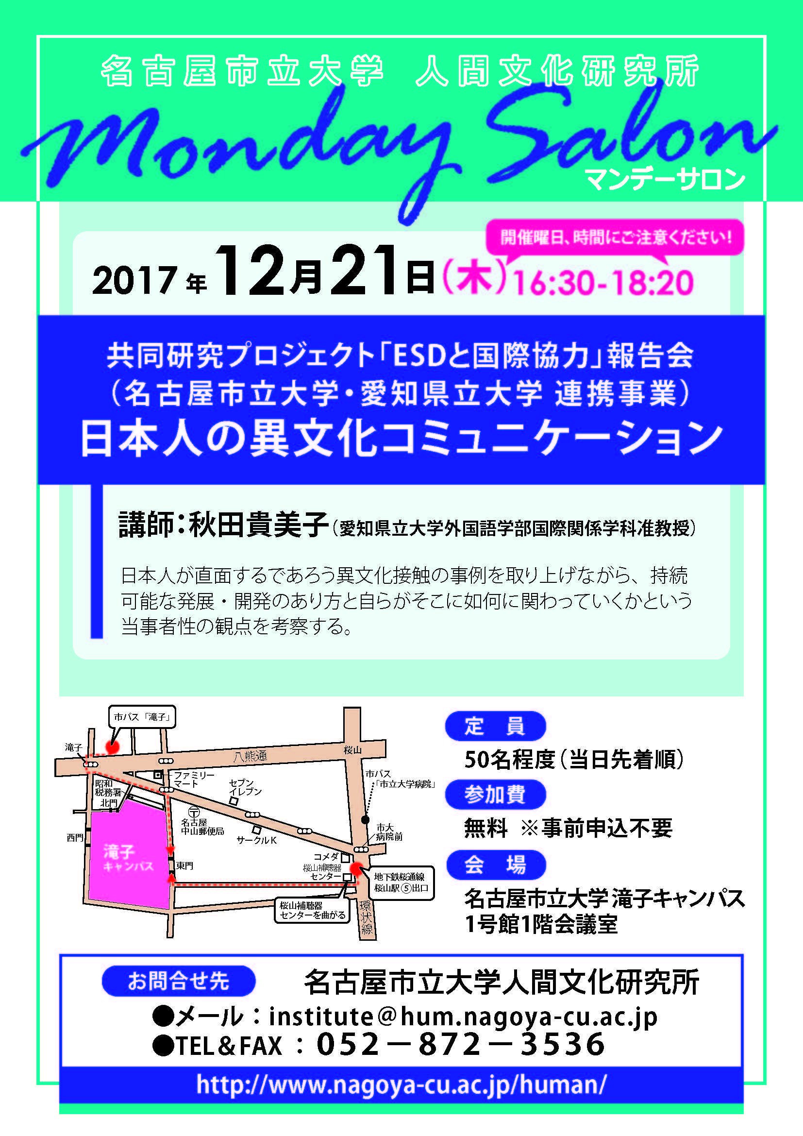 平成29年度地域連携事業(愛知県立大学・名古屋市立大学連携事業)名古屋市立大学 人間文化研究所 マンデーサロンに本学秋田貴美子准教授が登壇いたしました。
