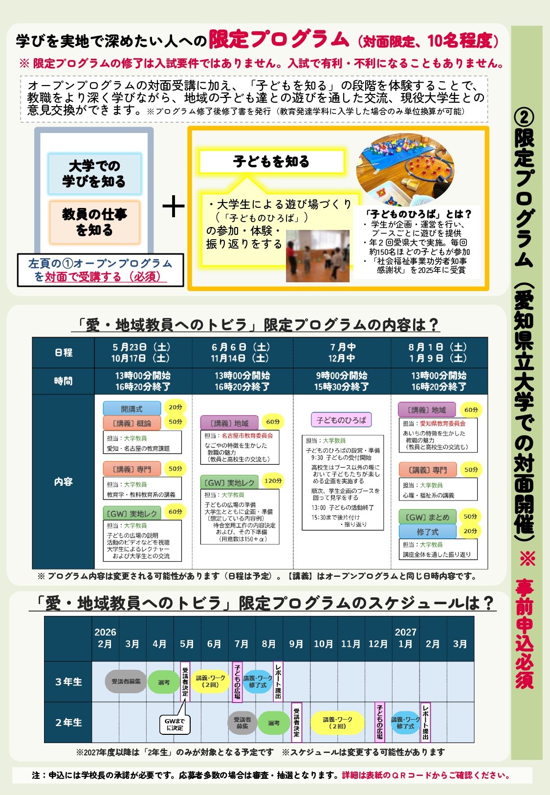 愛知県立大学では、文部科学省選定「地域教員希望枠を活用した教員養成大学・学部の機能強化事業」のもと、愛知県・名古屋市・長久手市・瀬戸市・日進市・尾張旭市の各教育委員会と連携して次世代の教員育成に取り組んでいます。この一環として、2026年度より地元の小学校教育に関心のある高校生を対象とした講座「愛・地域教員へのトビラ」を新たに開講します。地域の教育課をを自ら学び、地域と共創する力を備えた「未来の先生」を目指す高校生の皆様の参加をお待ちしております♪