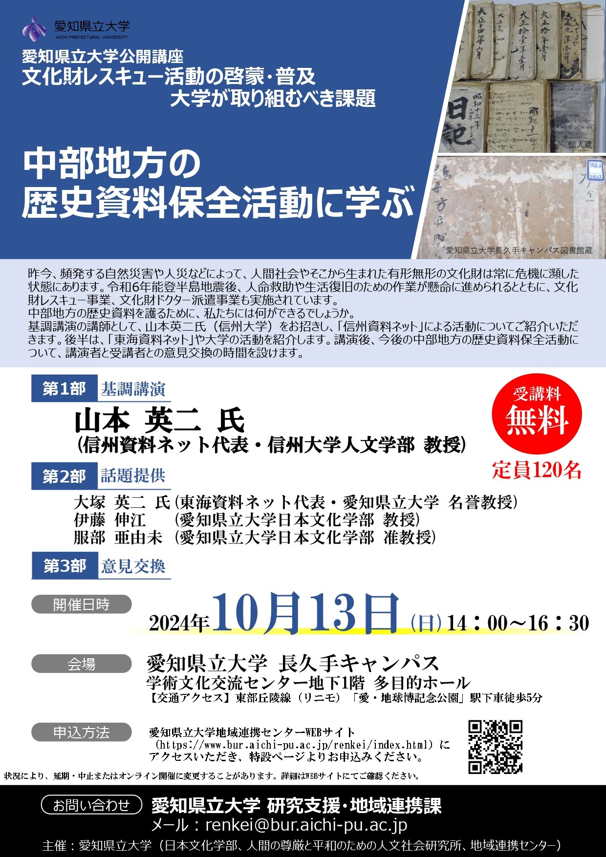 | 講師 | 山本 英二 氏(信州資料ネット代表・信州大学人文学部 教授) 大塚 英二 氏(東海資料ネット代表・愛知県立大学 名誉教授) 伊藤 伸江 (愛知県立大学日本文化学部 教授) 服部 亜由未 (愛知県立大学日本文化学部 准教授) |