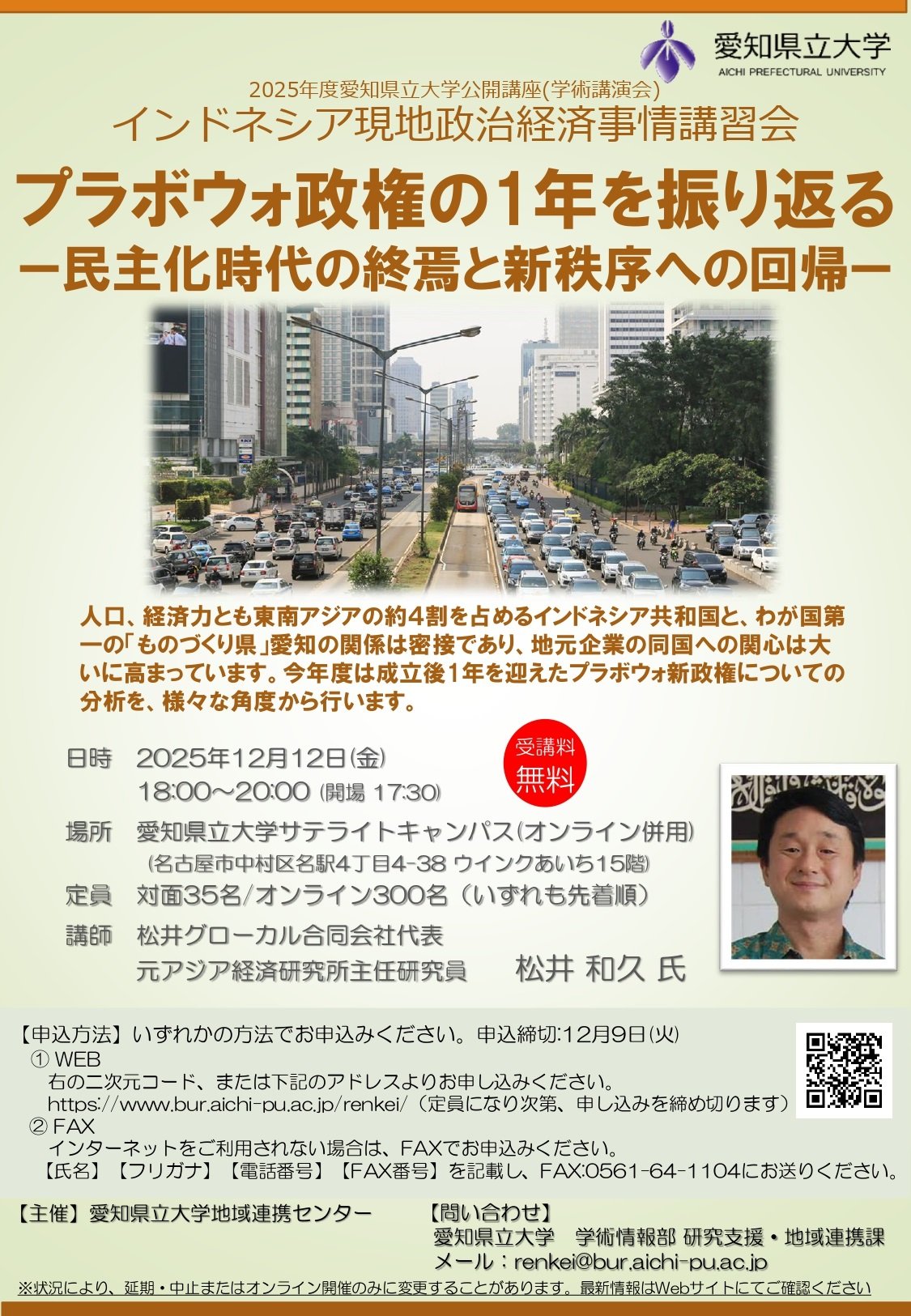 【12/12(金)】<対面/オンライン>インドネシア現地政治経済事情講習会「プラボウォ政権の1年を振り返る-民主化時代の終焉と新秩序への回帰-」(学術講演会)